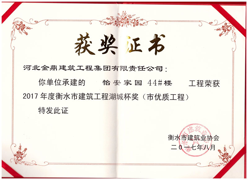 怡安家園44#樓工程榮獲2017年衡水市建筑工程湖城杯獎(市優(yōu)質(zhì)工程)